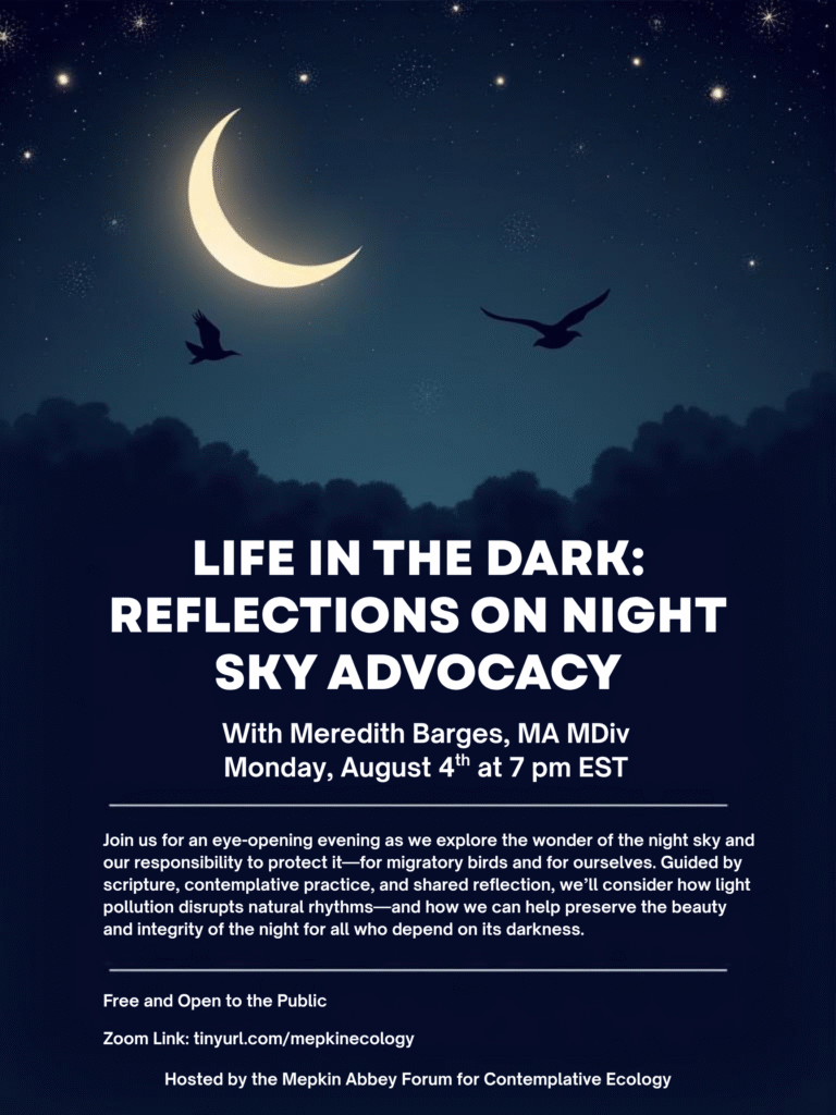 This program will immerse us in the wonder of the night sky and our duty to protect it—for migratory birds and for ourselves. Guided by contemplative practice, scripture, and shared reflection, we’ll consider how light pollution disrupts natural rhythms—and how we can help preserve the beauty and integrity of the night for all who depend on its darkness.
