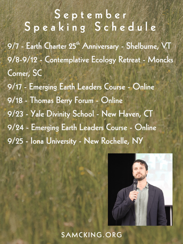 As a speaker, Sam has engaged over 70 schools, universities, and mission-driven organizations around the world. His talks integrate ecology, spirituality, and practical vision to inspire personal and collective transformation in service of a more just, compassionate, and vibrant world.